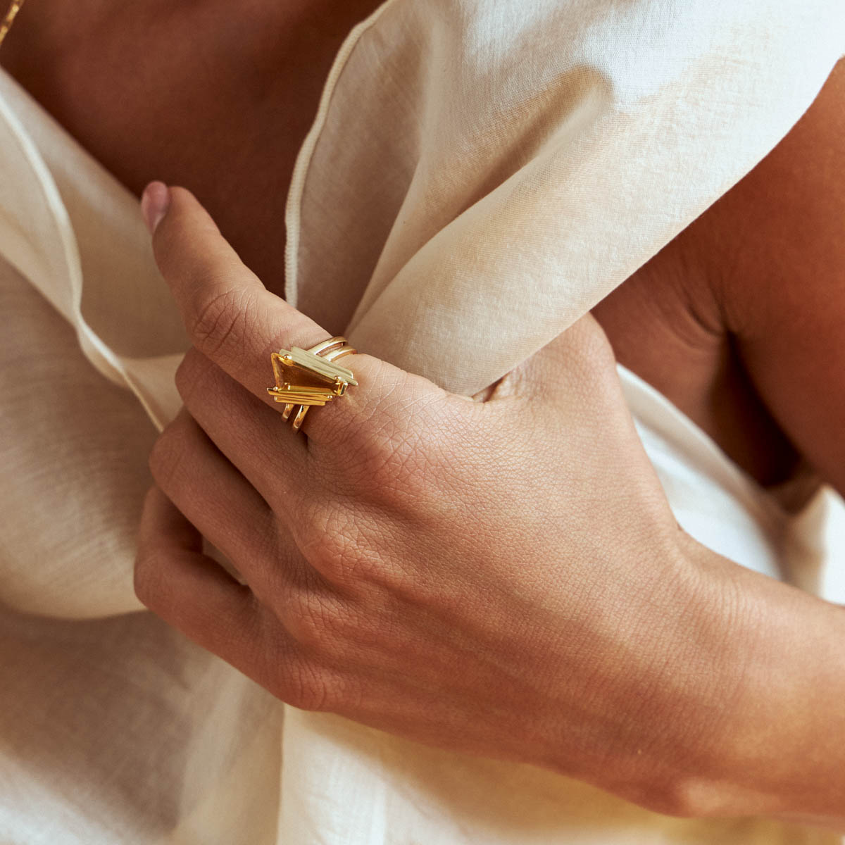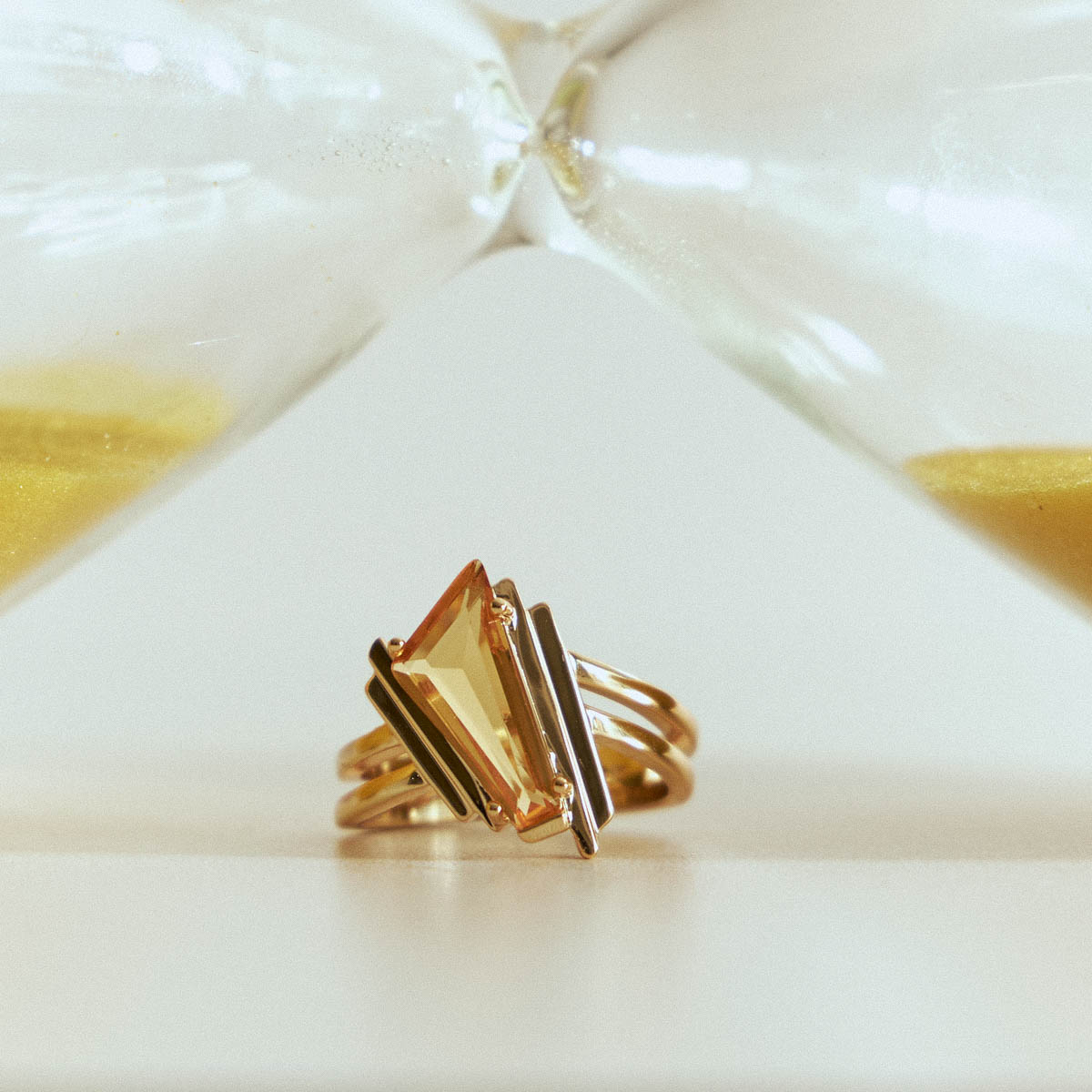 Anel Cristal Retangular Amarelo 4 Garras 2 Voltas Vazado